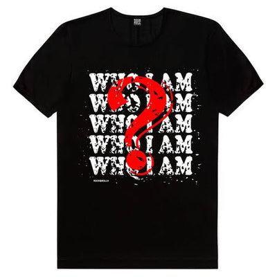 "Who I am" repeated white capital text